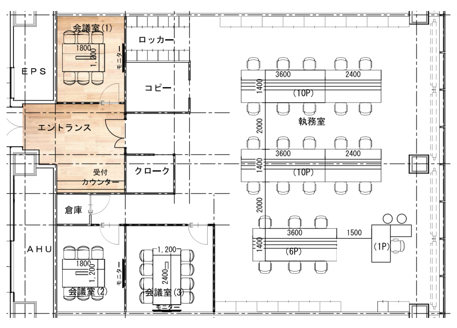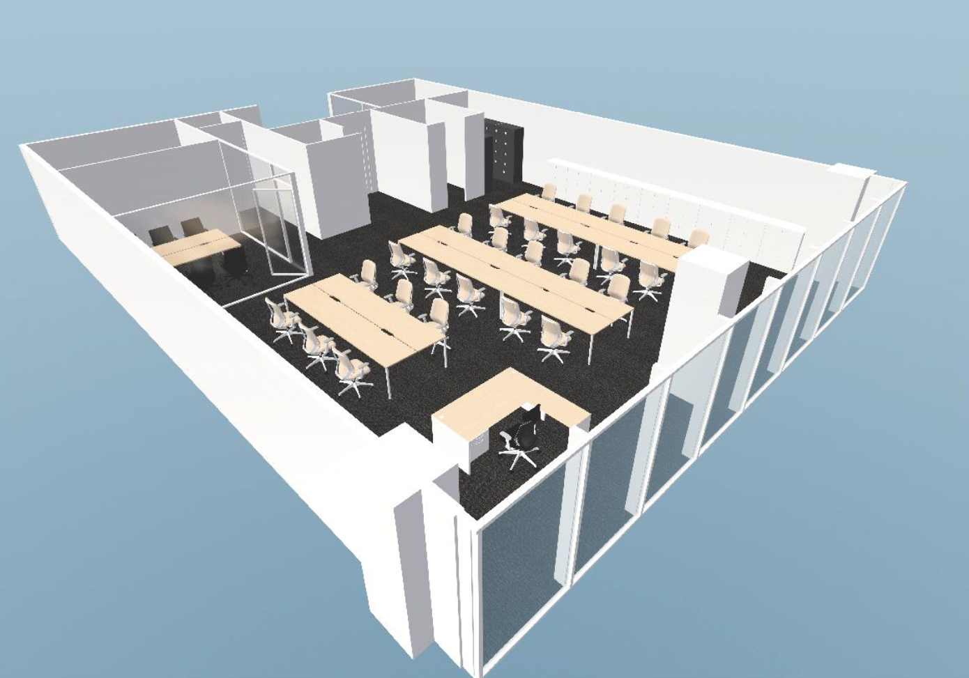 このエリアのフルセットアップオフィス、6名会議室×2、8名会議室×1、27名の座席を用意、