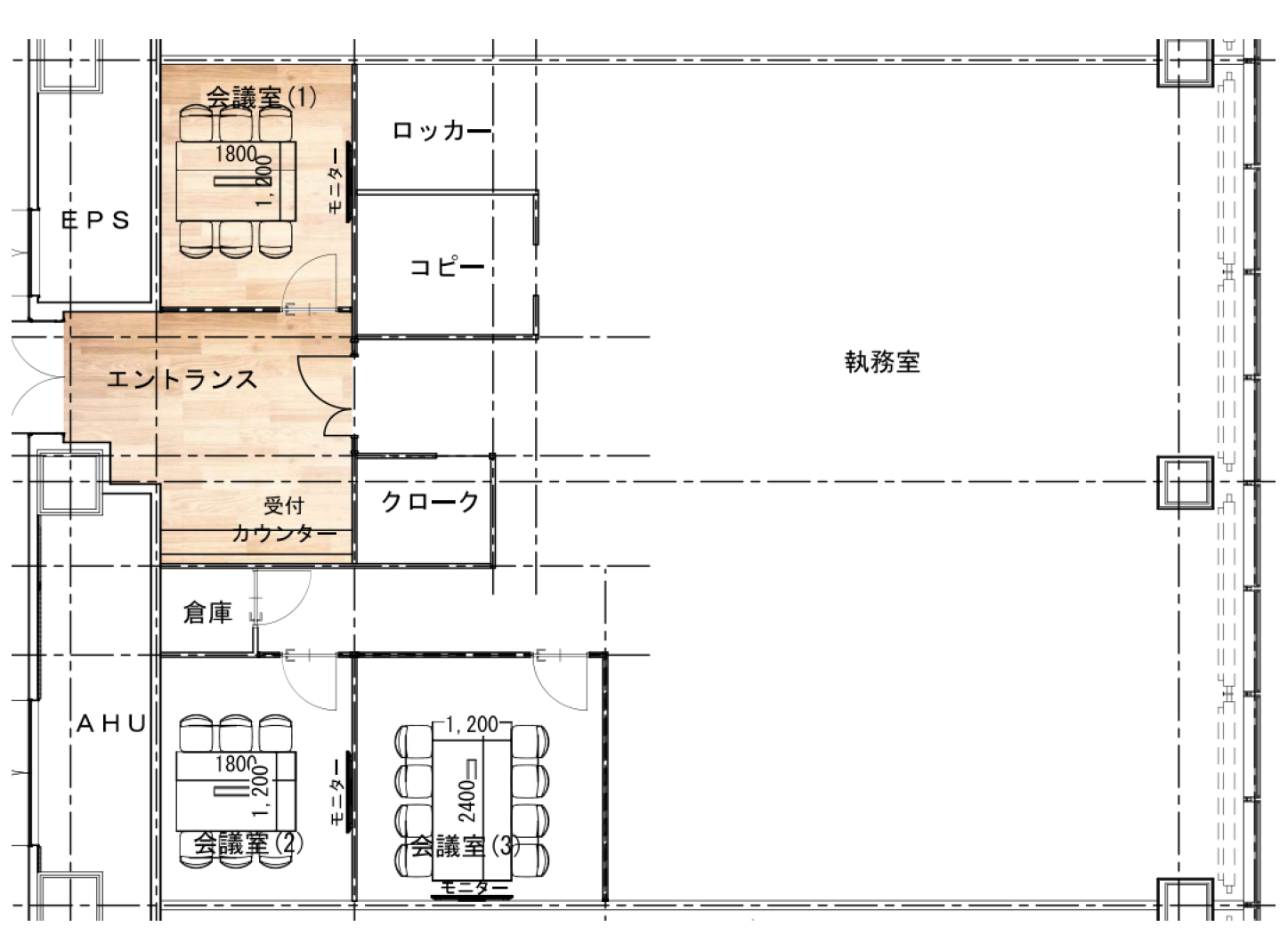 このエリアのフルセットアップオフィス、6名会議室×2、8名会議室×1、を用意、