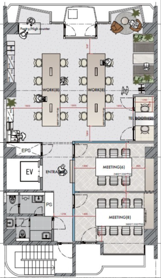 このエリアの内装付きオフィス。受付や会議室(2か所)がついており、リモートに対応したテレカンブースも設置図済み。