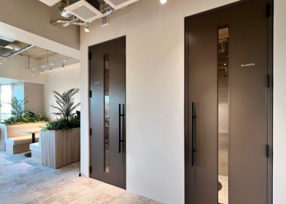 このエリアの内装付きオフィス。受付や会議室(2か所)がついており、リモートに対応したテレカンブースも設置図済み。