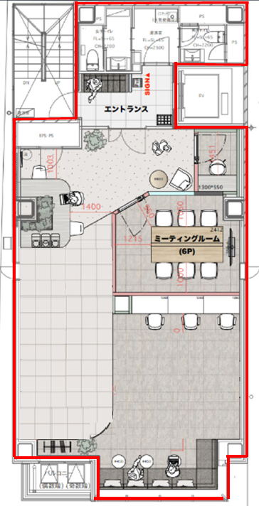 受付、ラウンジ、6名会議室、集中スペースあり、麹町の内装付きオフィスです。