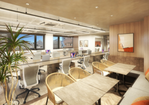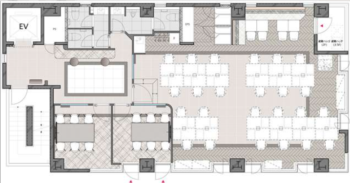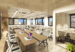 このエリアのフルセットアップオフィス。デスク・椅子・会議室・個室集中ブース・ラウンジ等を設置。