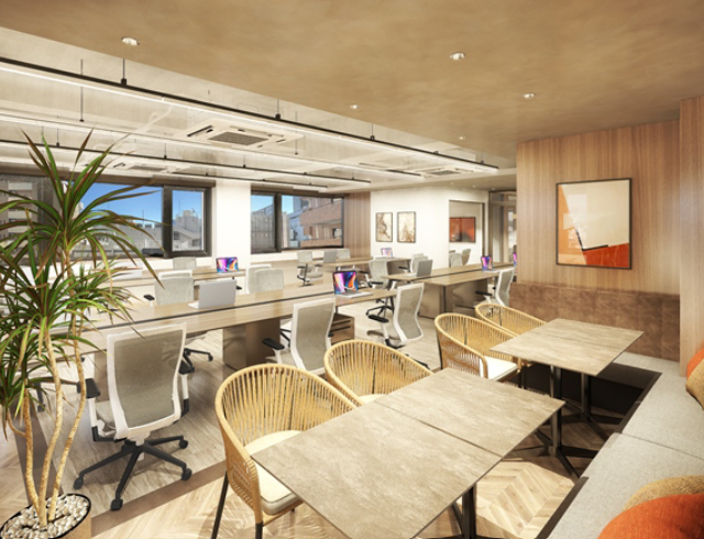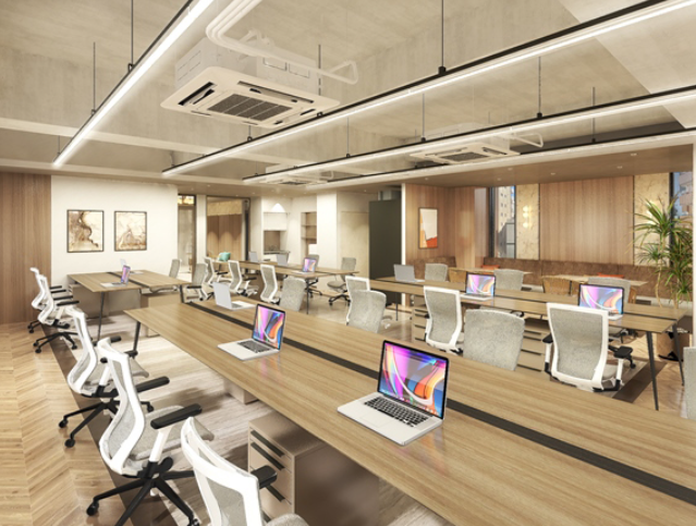 このエリアのフルセットアップオフィス。デスク・椅子・会議室・個室集中ブース・ラウンジ等を設置。