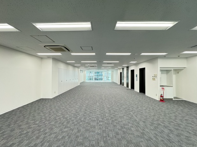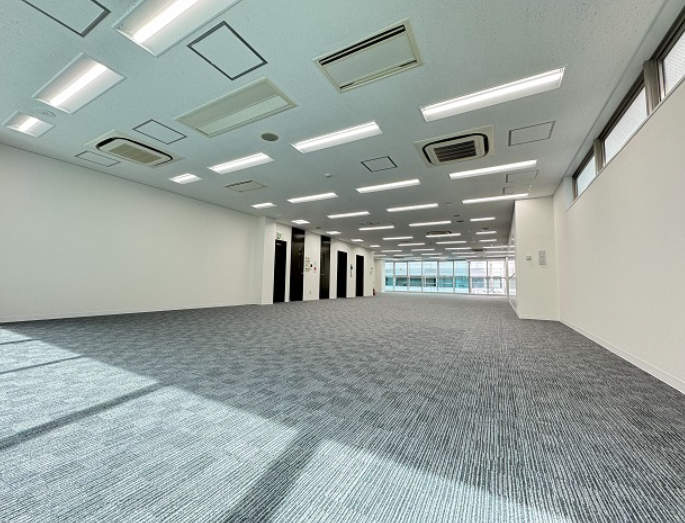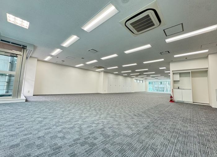 このエリアの居抜きオフィス、カーテンウォールのスタイリッシュな外観で2面採光の明るい室内も魅力。