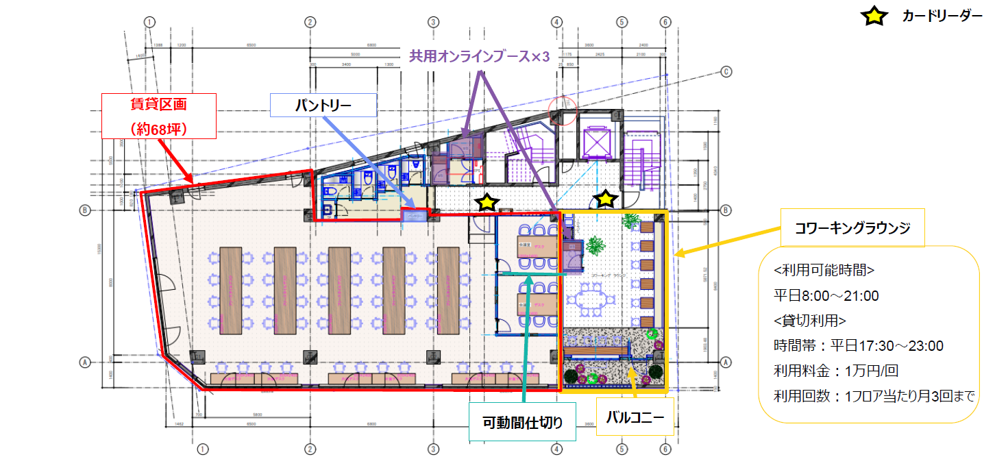 リノベーションによるワークラウンジ・コワーキング機能、タッチダウンラウンジ・会議室・オンラインブースを設置。