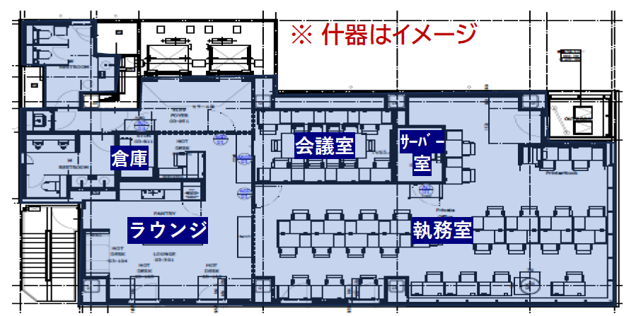 このエリアのフルセットアップオフィス。ハーフセットアップ(サービスオオフィス)サーバー室・倉庫も設置済。