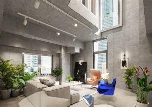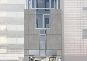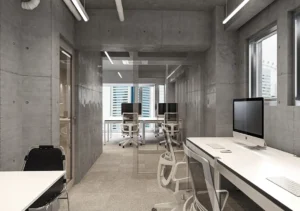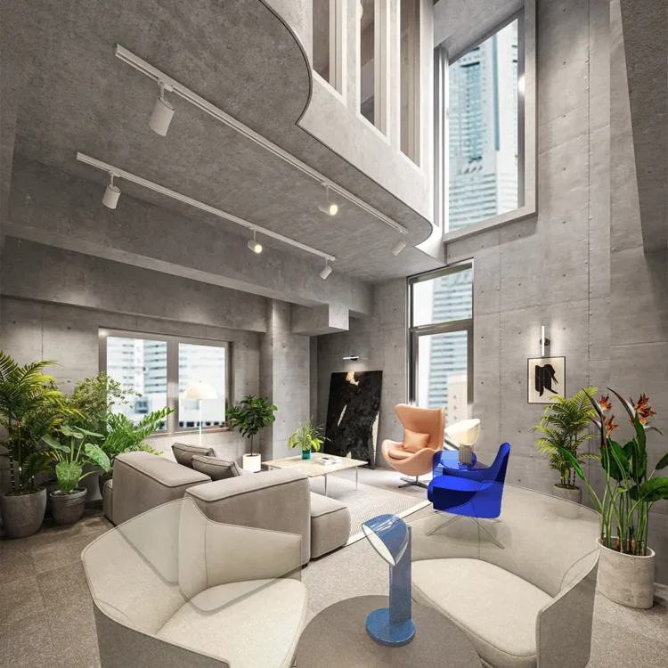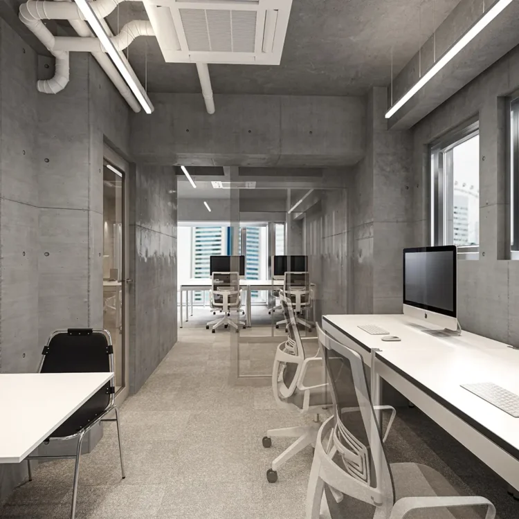 SRC造地上5〜10階建ての賃貸オフィス。個別空調、男女別トイレ、機械警備、光ファイバーエレベーター1基、24時間利用可。