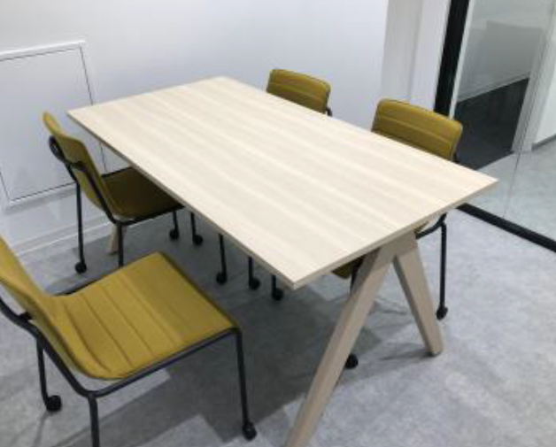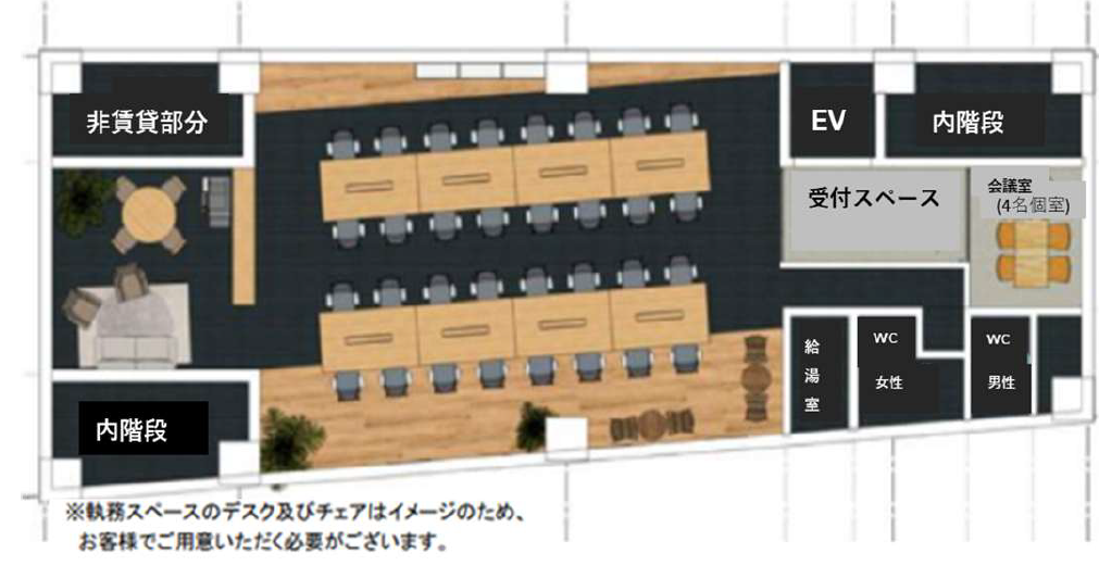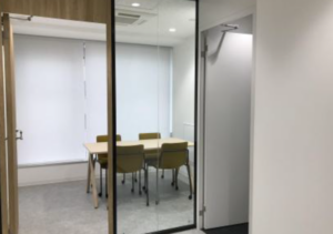 受付、会議室4人用、ミーティングスペースの内装がセットアップ、32人程度の企業向け、