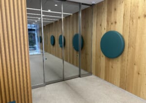 全面ガラス張りのスタイリッシュな外観、型枠兼仕上げ材の天然木などを用いた温かみのあるインテリア。
