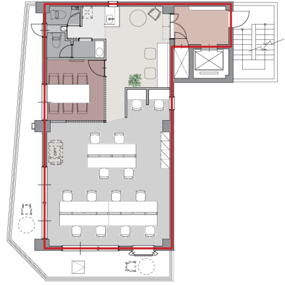 このエリアのフルセットアップオフィス、6名用の個室会議室とラウンジが設置済み。執務室は12名前後でのご利用を想定。
