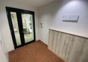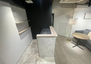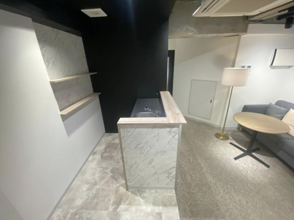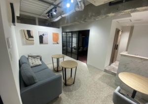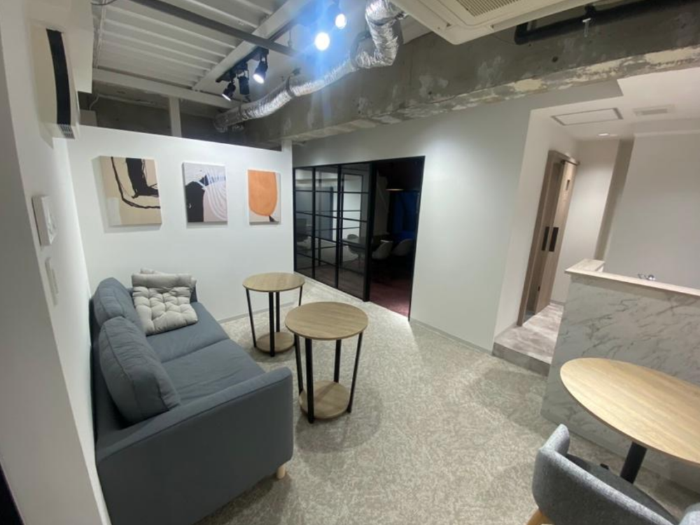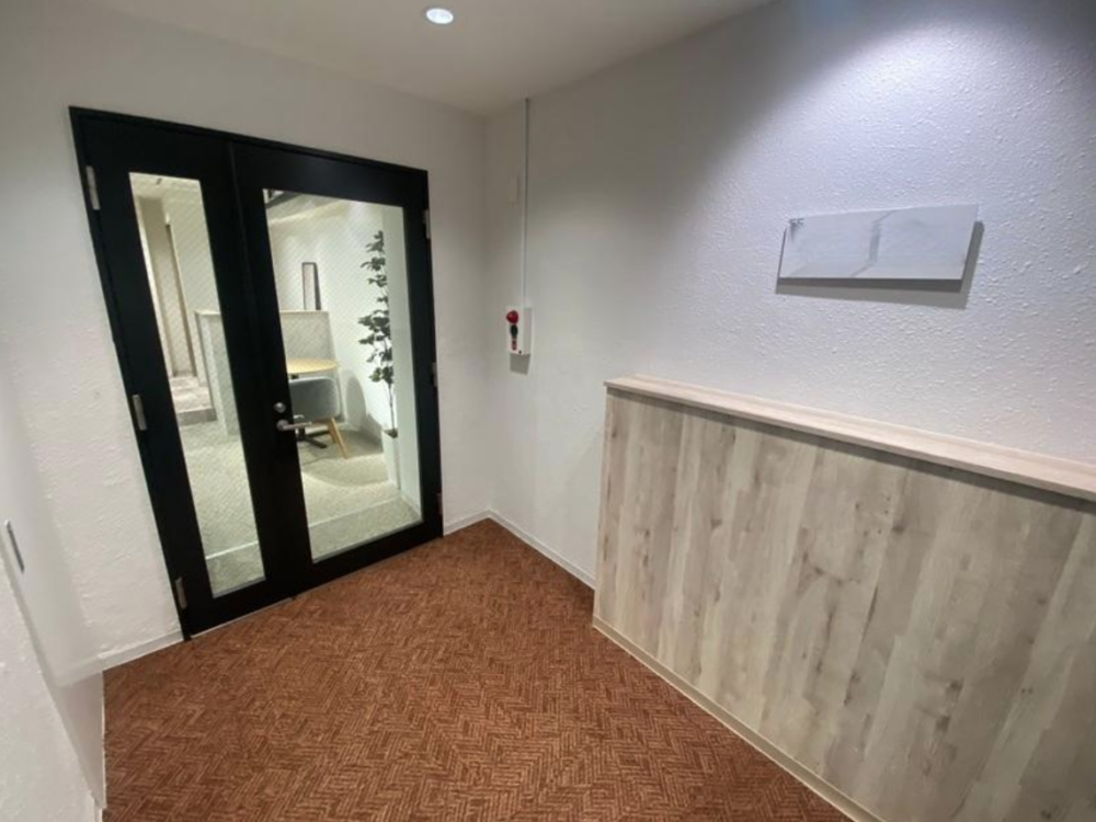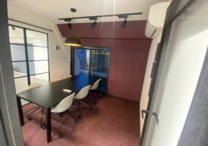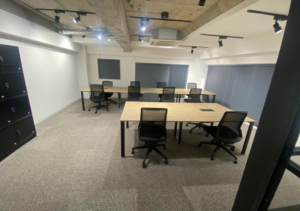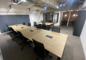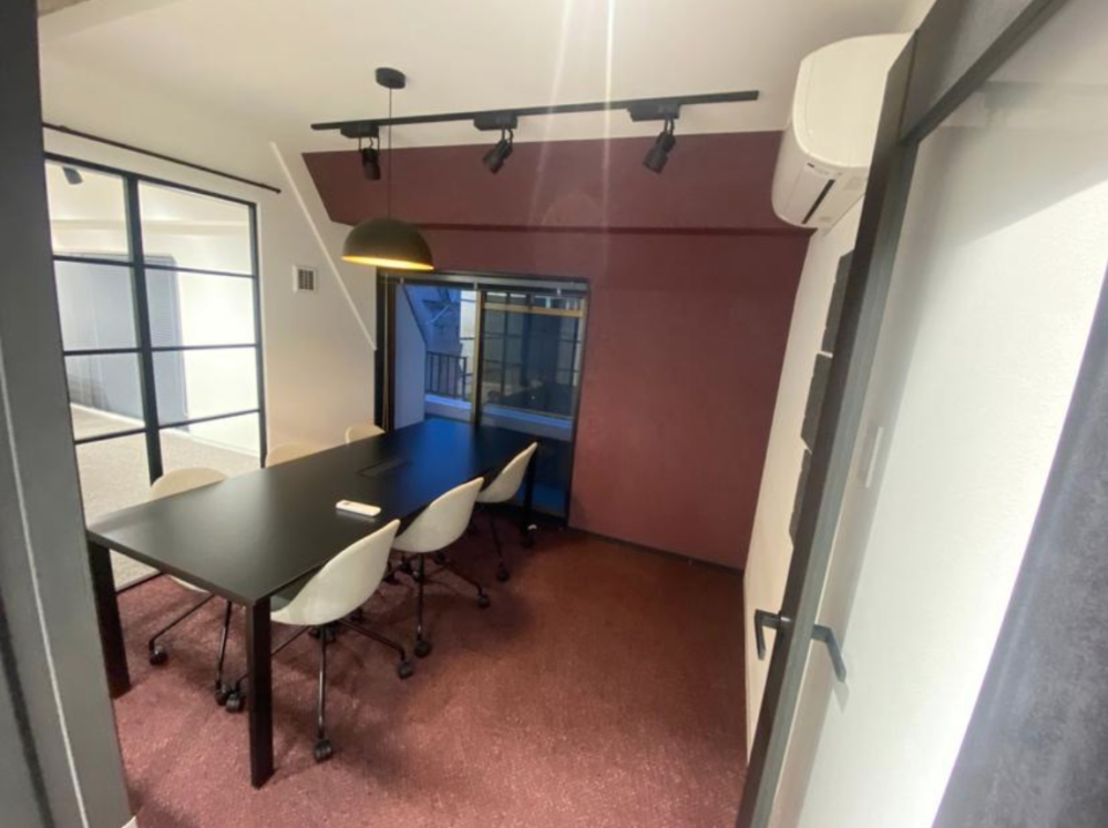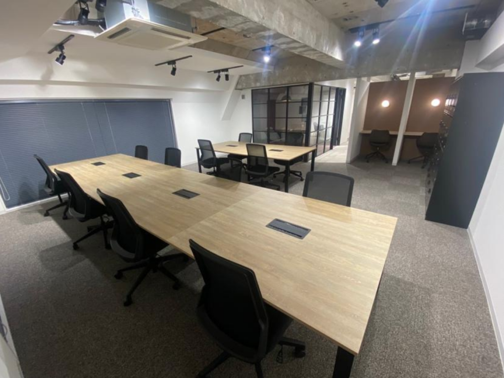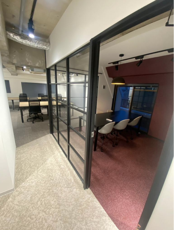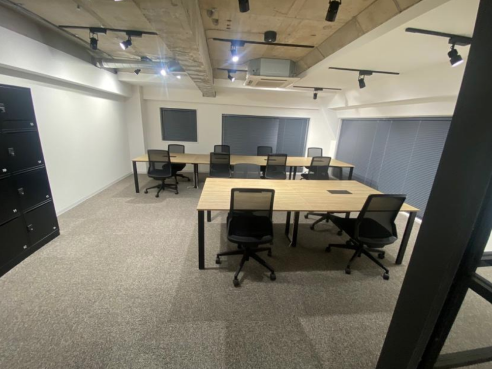 このエリアのフルセットアップオフィス、6名用の個室会議室とラウンジが設置済み。執務室は12名前後でのご利用を想定。