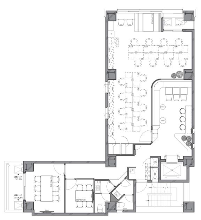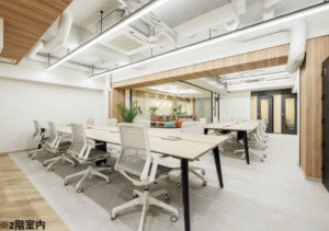 このエリアのセットアップオフィス、4名用・6名用会議室、テレカンブース2室、執務室什器16名分設置)