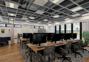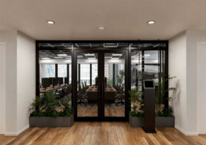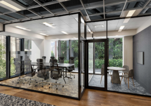 スケルトン天井、ガラス張りの会議室、眺望も最高、京橋の内装付きオフィスです。