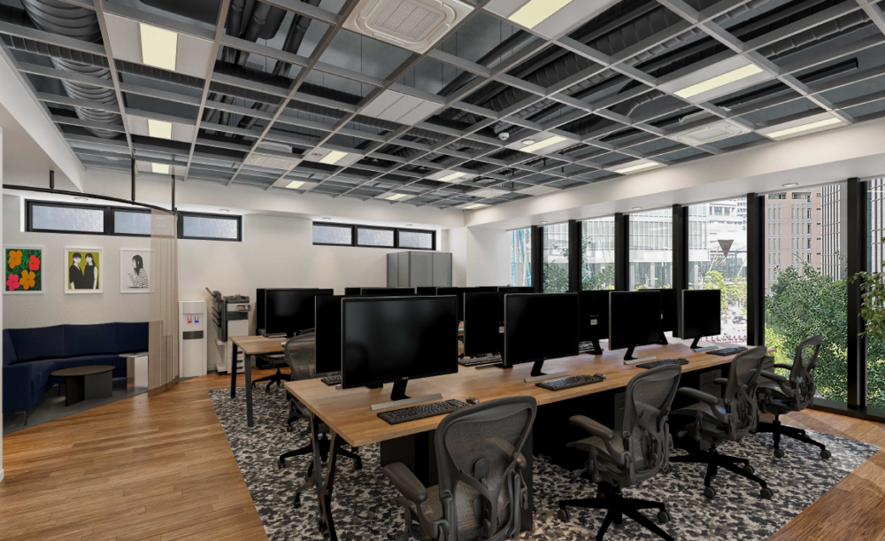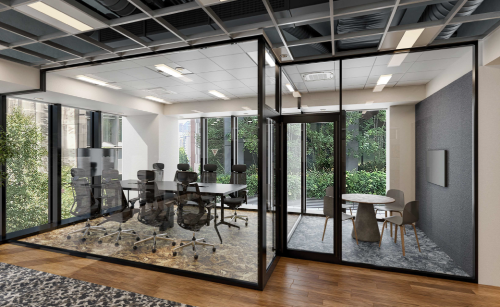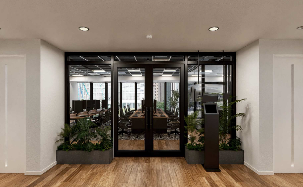 スケルトン天井、ガラス張りの会議室、眺望も最高、京橋の内装付きオフィスです。