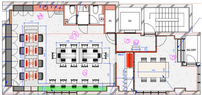 このエリアの居抜きオフィス、受付、6名会議室、座席数24が設置済み。