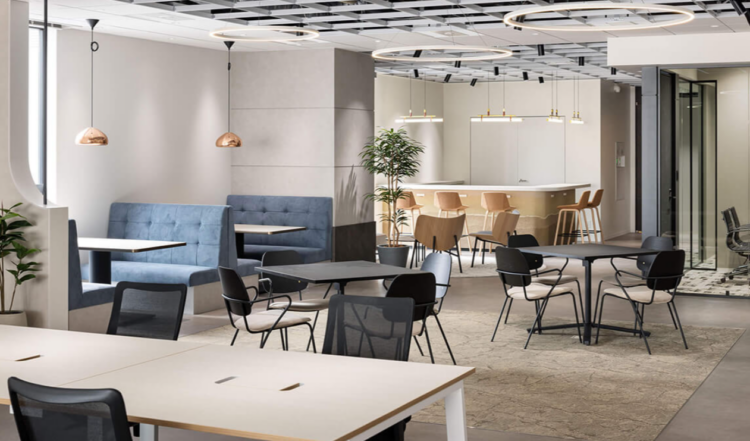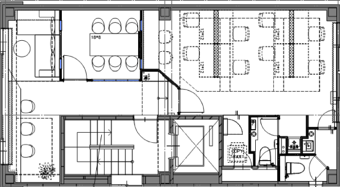 このエリアのセットアップオフィスで6名用の個室会議室とラウンジスペースが設置済み。