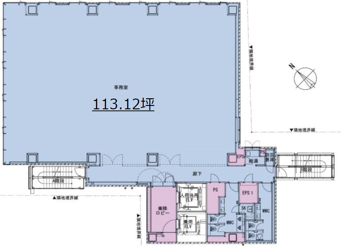 2023年4月竣工、鉄骨造(S造)地上11階建ての江戸通りに面する賃貸オフィス。天井高2,700 mm。