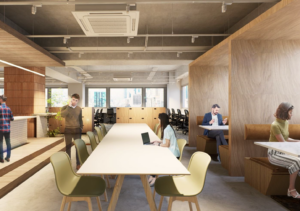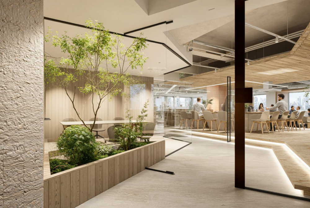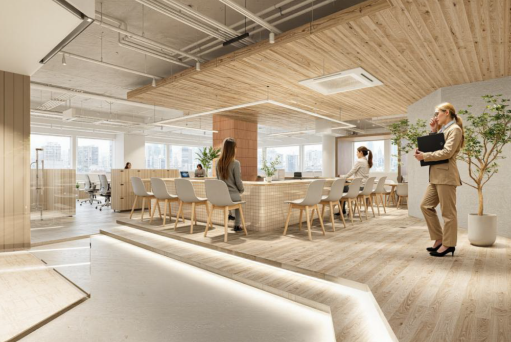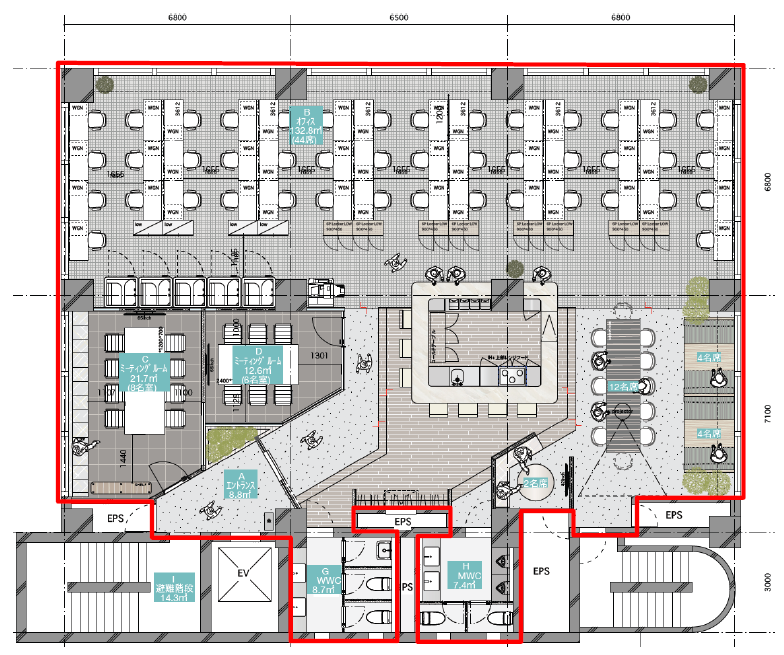 執務ゾーンを充実させながらも、リフレッシュスペースも広く、交流の生まれやすいオフィス空間を実現できます。