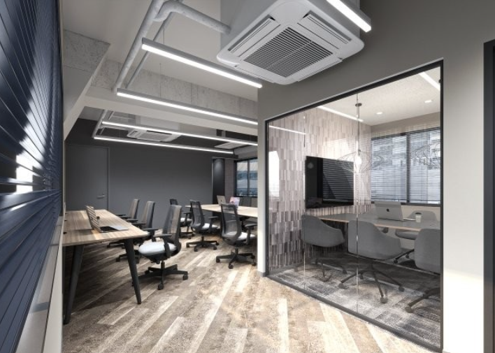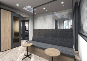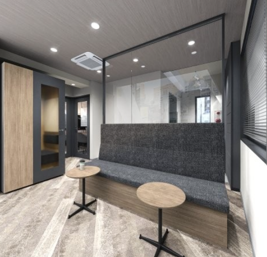 このエリアのセットアップオフィス。会議室×1、テレカンブース×1、デスク・チェア×9を設置.