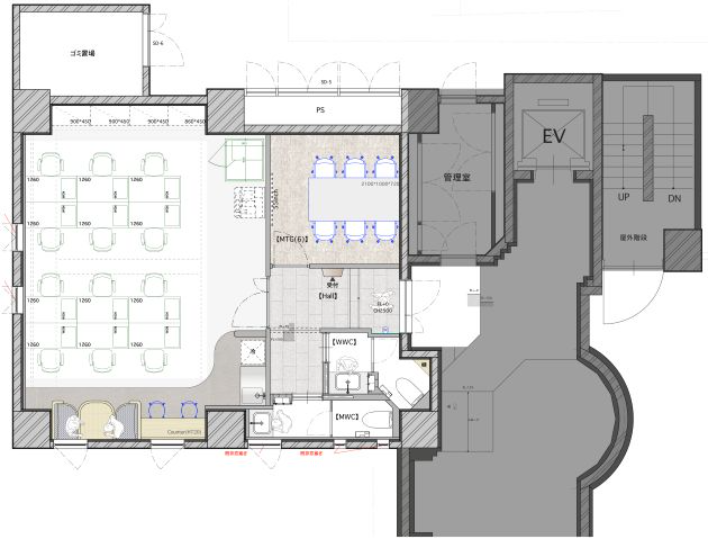 このエリアのフルセットアップオフィス、テレカンブース1室、6名用会議室、執務室什器12名分設置、