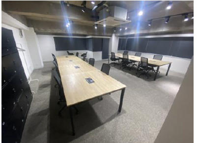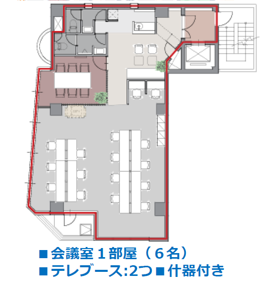 このエリアのフルセットアップオフィス、6名用の個室会議室とラウンジが設置済み。執務室は14名前後でのご利用を想定。