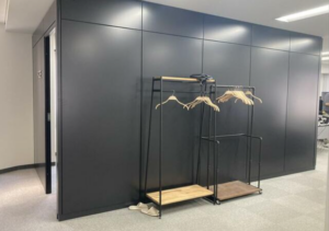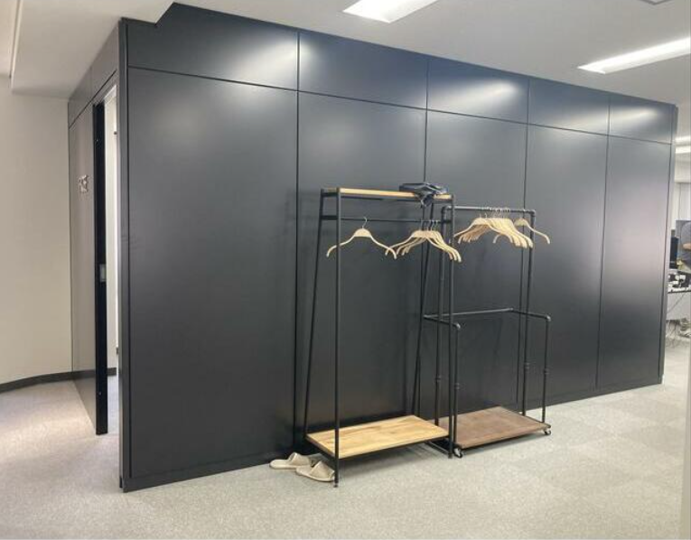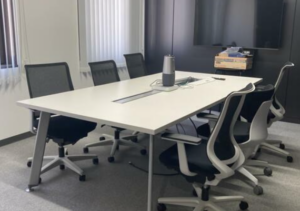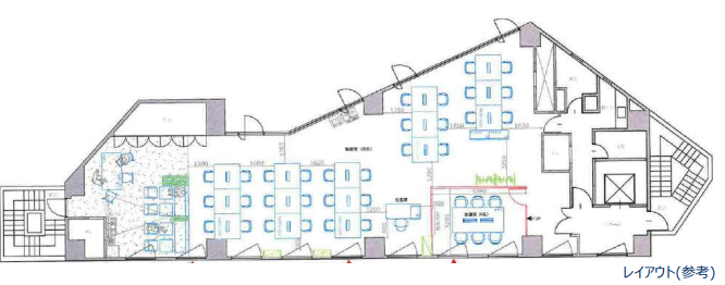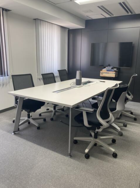 このエリアの居抜きオフィス、6名用の個室会議室が設置済み。執務室は最大35名前後でのご利用を想定。