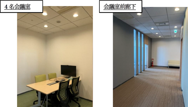 このエリアのセットアップオフィス(什器付き)4名用・6名用の個室会議室と個室ブースが設置済み。執務室は30名前後でのご利用を想定。