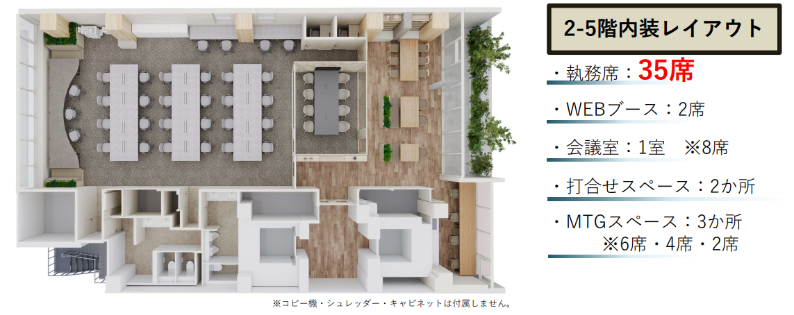 執務席35席、WEBブース2席、会議室8名、打ち合わせスペース2か所、MTGスペース3か所(6席、4席、2席)​が完備。