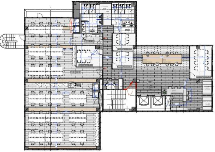 このエリアの大型セットアップオフィス、4名用×2・6名用・8名用の個室会議室とラウンジ、テレカンブースが設置済み。