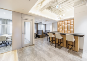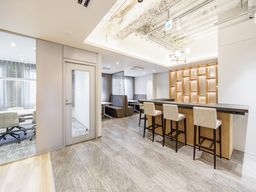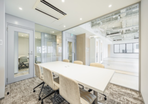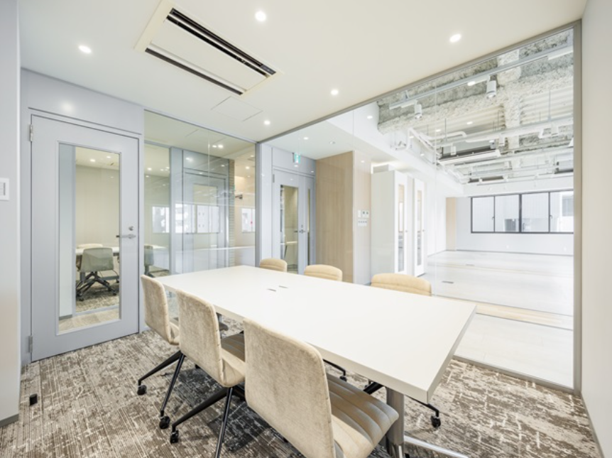 このエリアの大型セットアップオフィス、4名用×2・6名用・8名用の個室会議室とラウンジ、テレカンブースが設置済み。