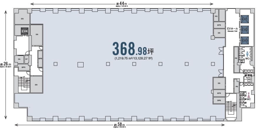 このエリアの大型居抜きオフィス、10名会議室、8名会議室×2、図書室、更衣室×2、執務室は120席前後でのご利用を想定。