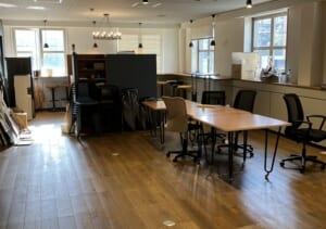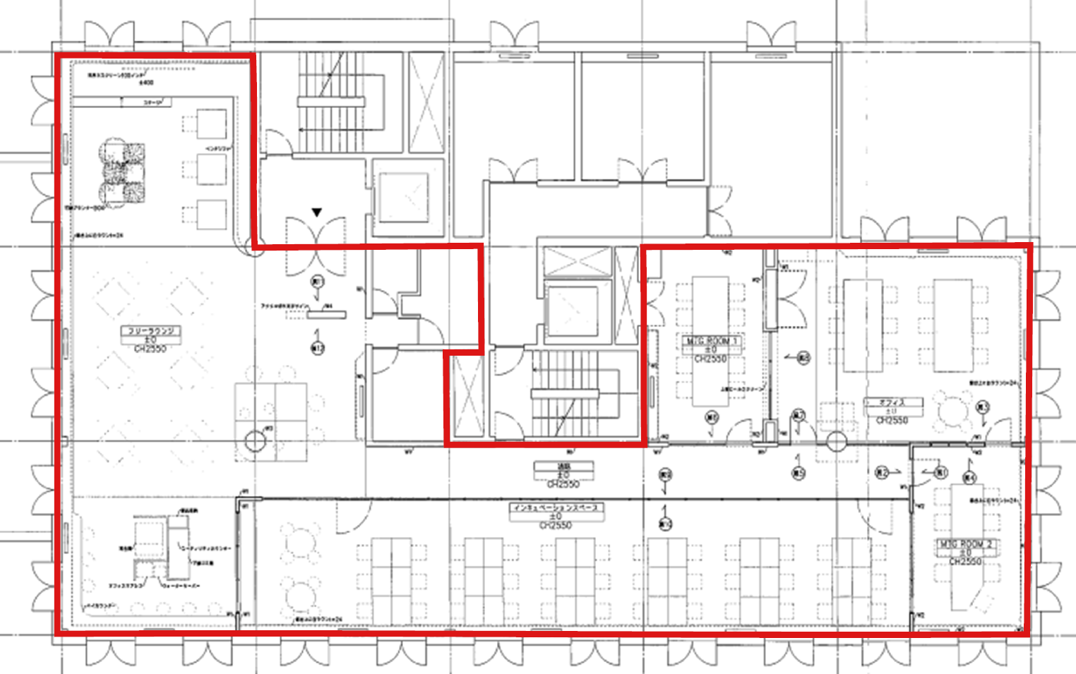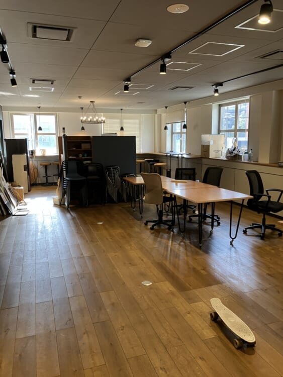 大きなラウンジスペースと執務室スペースが設置済み。執務室は50-70名前後でのご利用を想定。