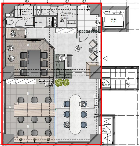 このエリアのセットアップオフィス、6名用の個室会議室とラウンジ、フォンブースが設置済み。執務室は15名前後でのご利用を想定。