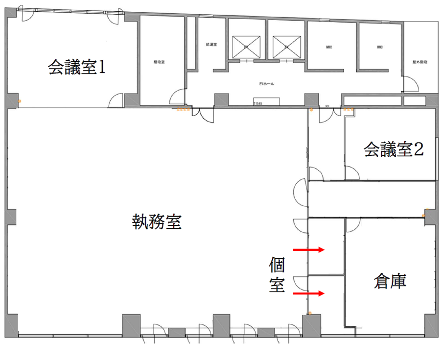 個室会議室が2カ所と倉庫スペースが設置済み。執務室は40-50名前後でのご利用を想定。