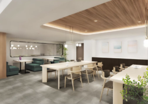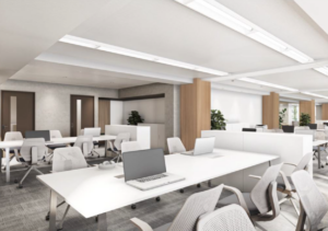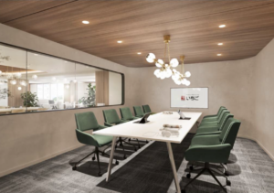 このエリアの大型セットアップオフィス、6名用・8名用・10名用の個室会議室と個室ブース、ラウンジスペースが設置済み。