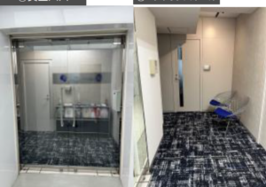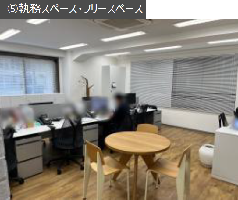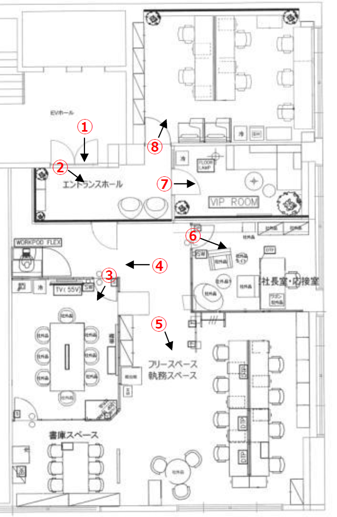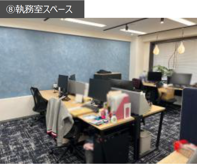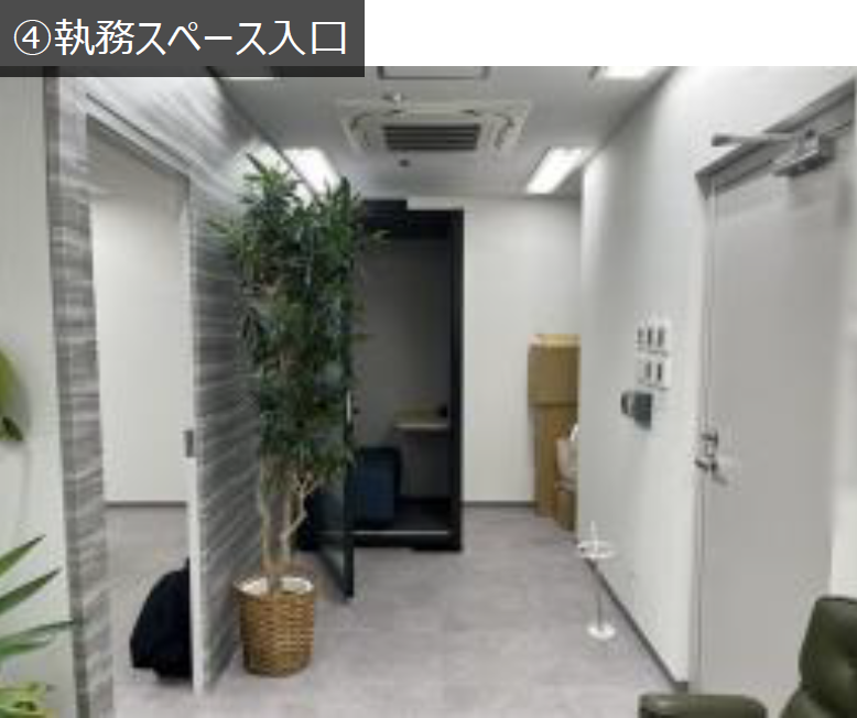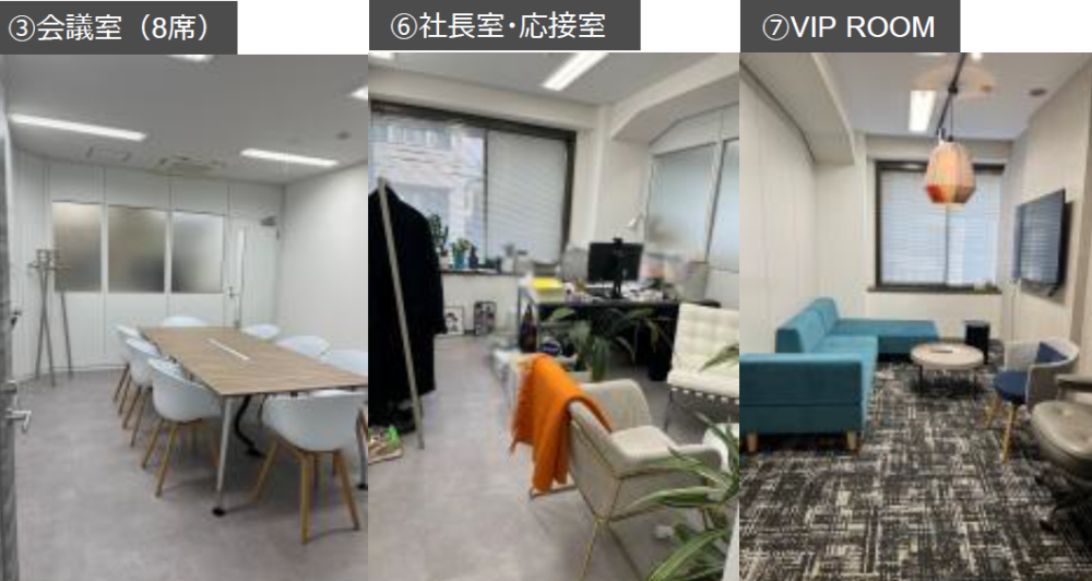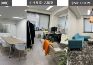 このエリアの居抜きオフィス、8名用の個室会議室と役員室、休憩スペースが設置済み。