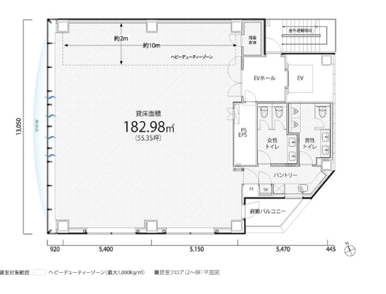 無柱で開放的なオフィス空間、大型ガラス窓、天井高2.75m、個別空調・省エネガラス。