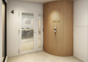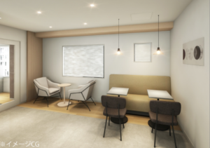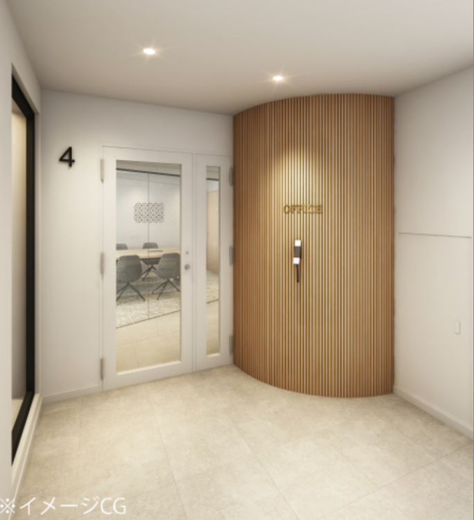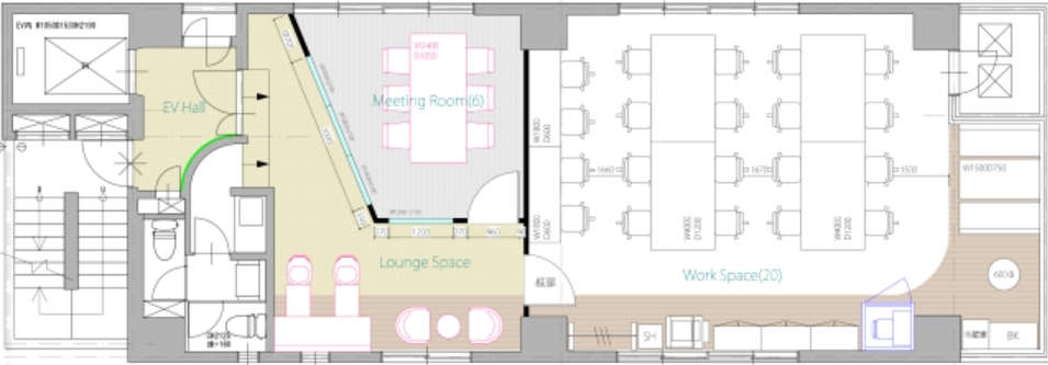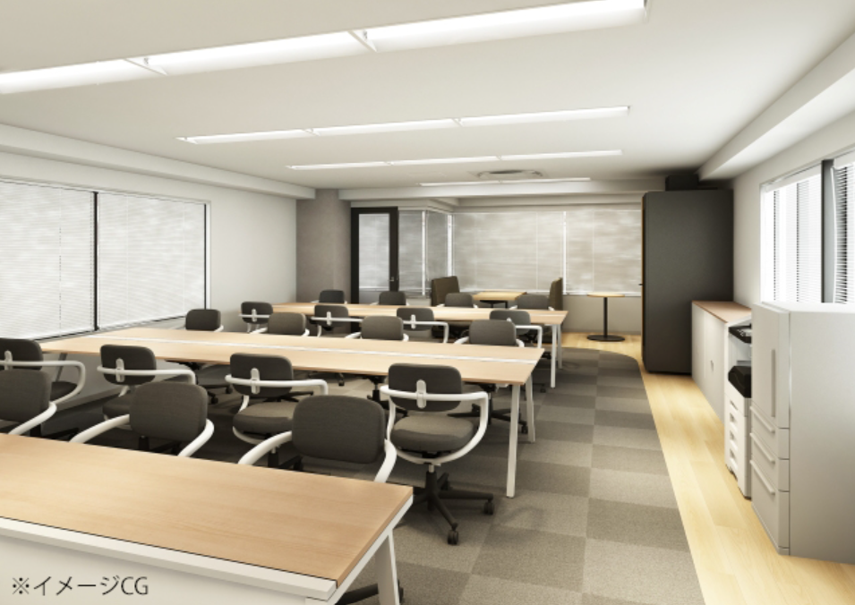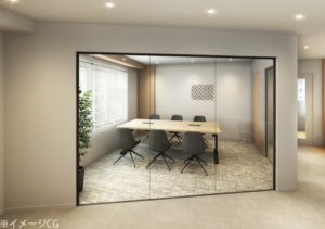 このエリアのセットアップオフィス、6名用の個室会議室と個室ブースが設置済み。執務室は20名前後でのご利用を想定。