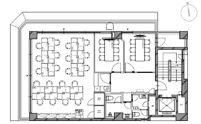 6名用×2の個室会議室と個室ブース2ヵ所が設置済み。執務室は20名でのご利用を想定。