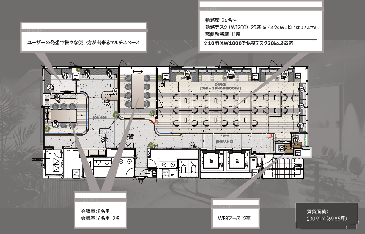 会議室などの造作も備わっており、敷金0相談と合わせると大幅にコストを抑え移転することが可能。