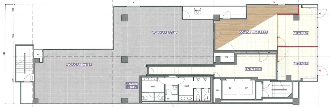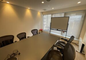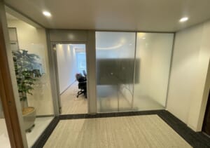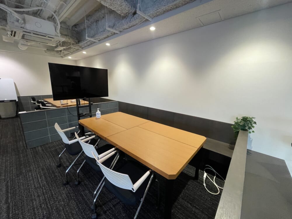 このエリアのセットアップオフィス、6名用会議室×2とフォンブースが設置済み。執務室は35-50名前後でのご利用を想定。