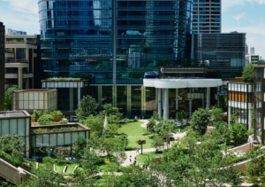敷地内には中央広場、果樹園、屋上緑化があり。商業施設も複数あり、飲食店、カフェ、クリニック、ハイブランドショップなどが入居中。