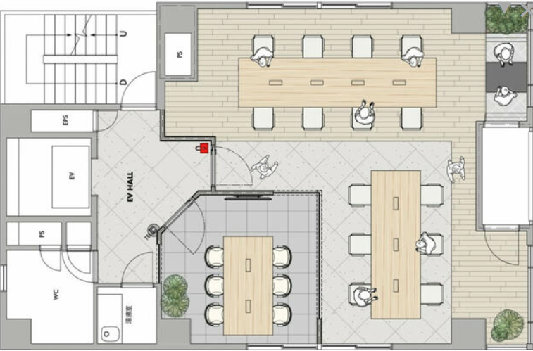 このエリアのセットアップオフィス、6名用の個室会議室が設置済み。執務室は14名前後でのご利用を想定。