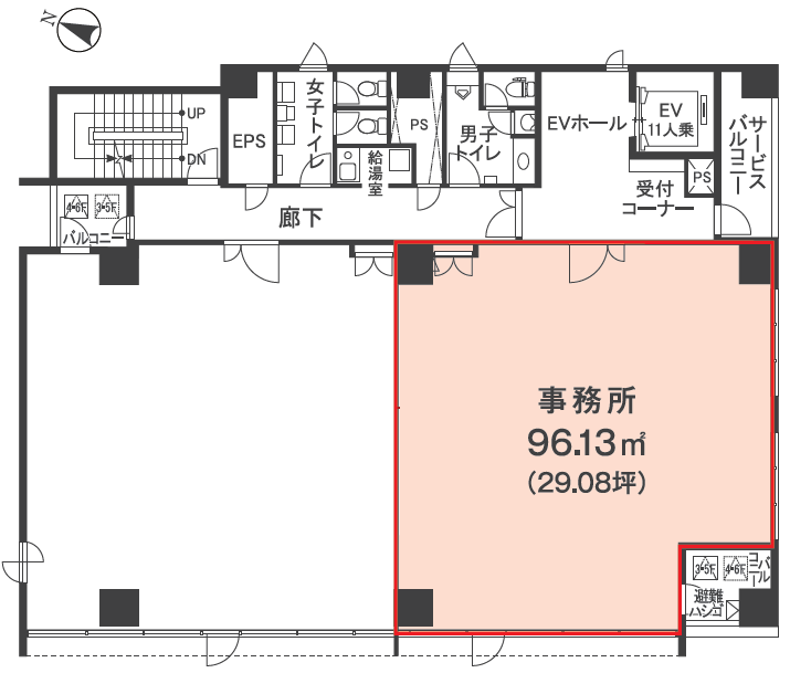 使いやすい整形の室内、水回り外出しで執務効率の高いレイアウトの青山の賃貸オフィスです。