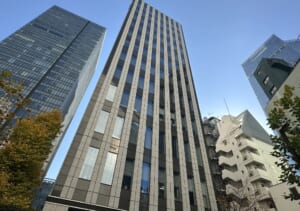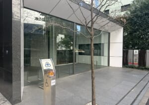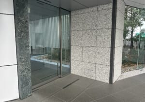 このエリアの居抜きオフィス、重厚感のある石張りの外観、シャープなイメージのエントランス、