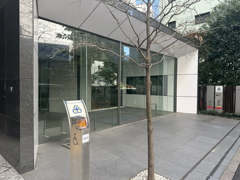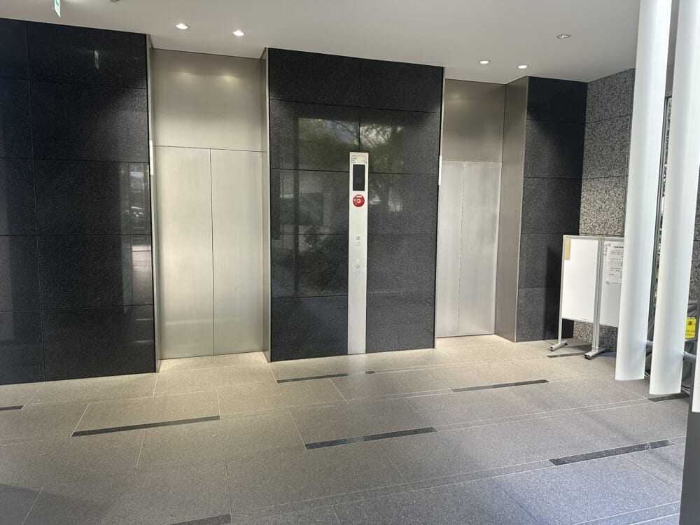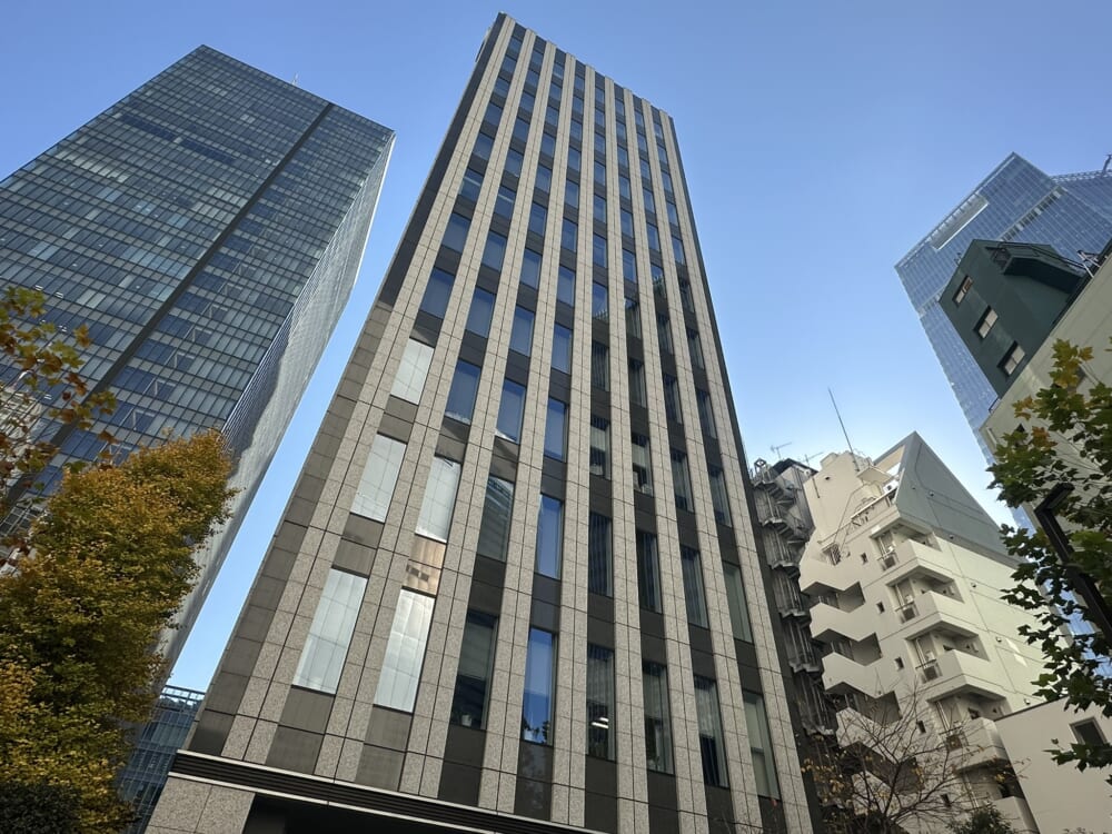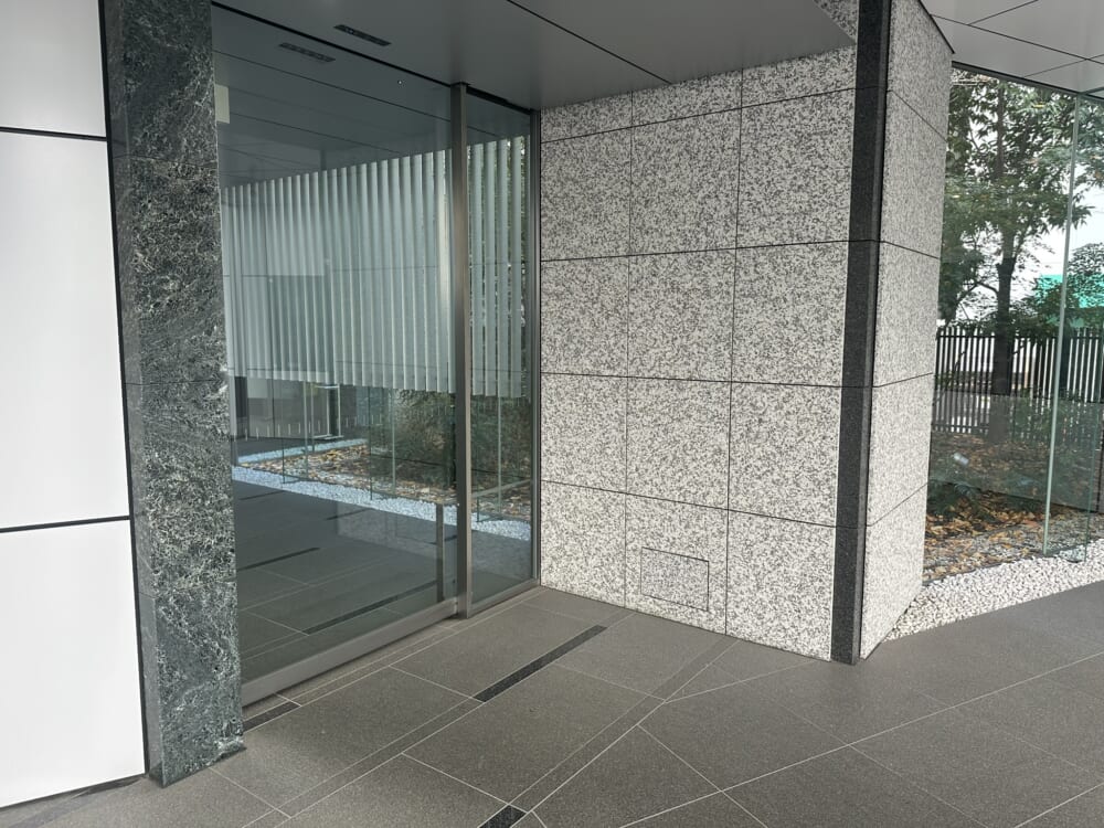 このエリアの居抜きオフィス、重厚感のある石張りの外観、シャープなイメージのエントランス、