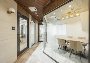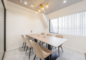 このエリアの敷金なし、原状回復なしのセットアップオフィス6名用の個室会議室×2と個室ブースが設置済み。執務室は22名前後でのご利用を想定。