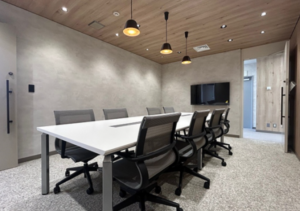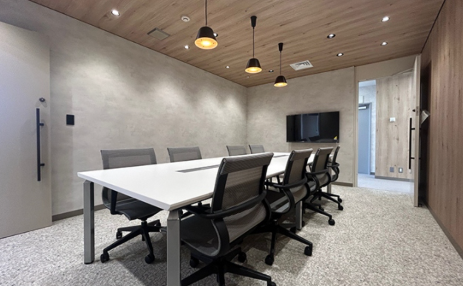 ラウンジと、複数の会議室を完備。執務室は窓面が多く明るい整形の区画で、今後の増員も見据えた効率的なレイアウトが可能。