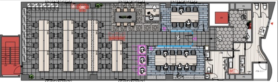 このエリアのセットアップオフィス、個室ブース3室、12名用・8名用会議室、執務室什器36席分設置。