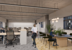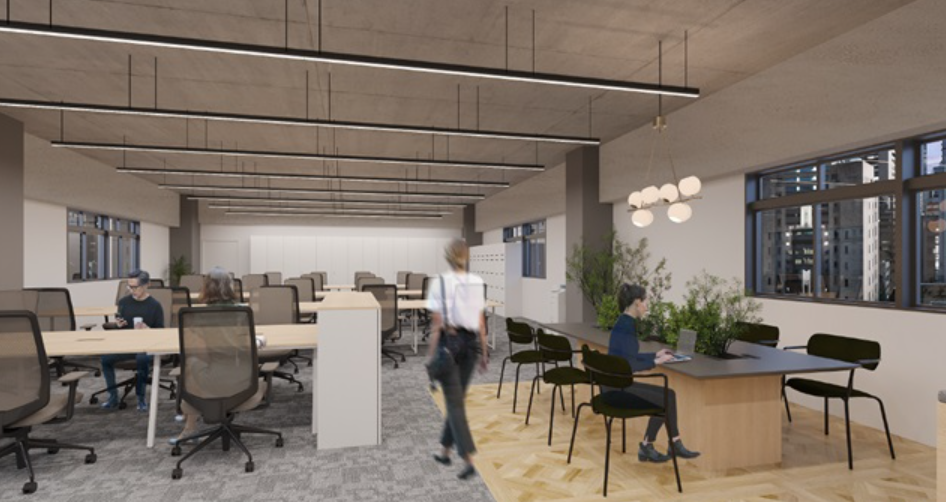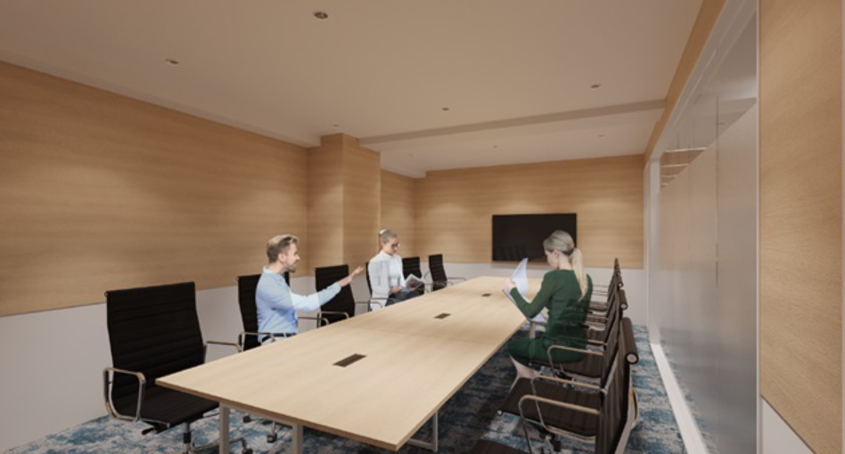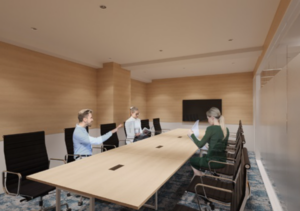 このエリアのセットアップオフィス、個室ブース3室、12名用・8名用会議室、執務室什器36席分設置。